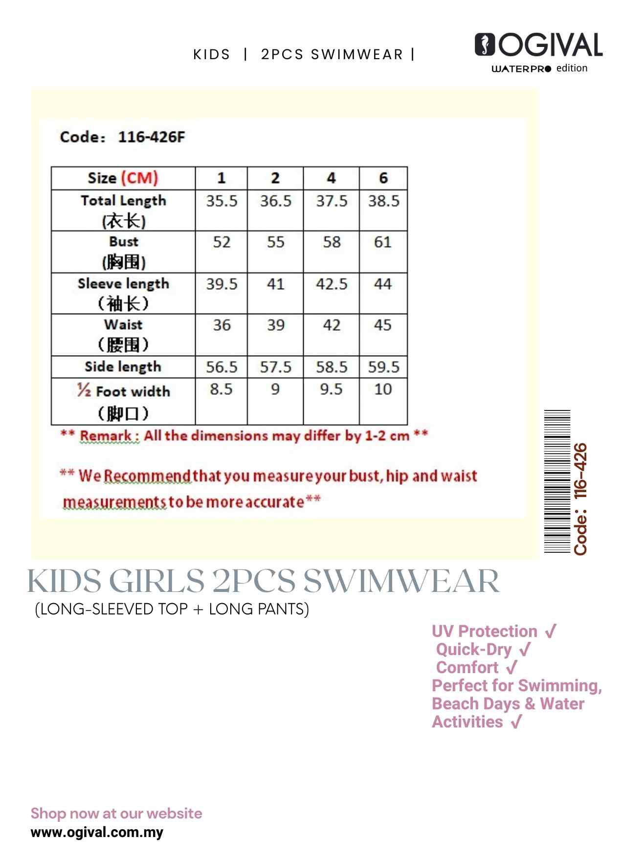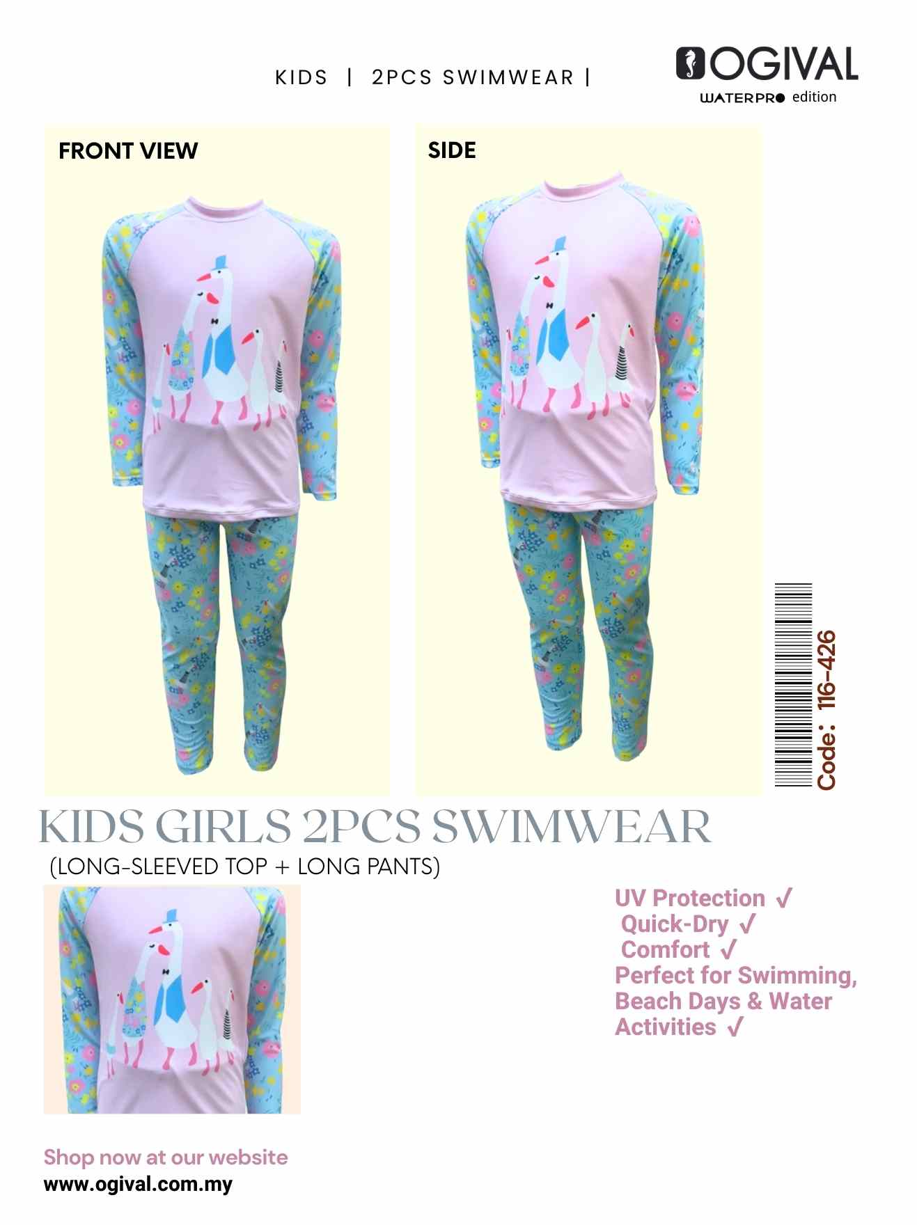 Ogival Kids Girls 2pcs Swimwear (Long-Sleeved Top + Long Pants)✨NEW